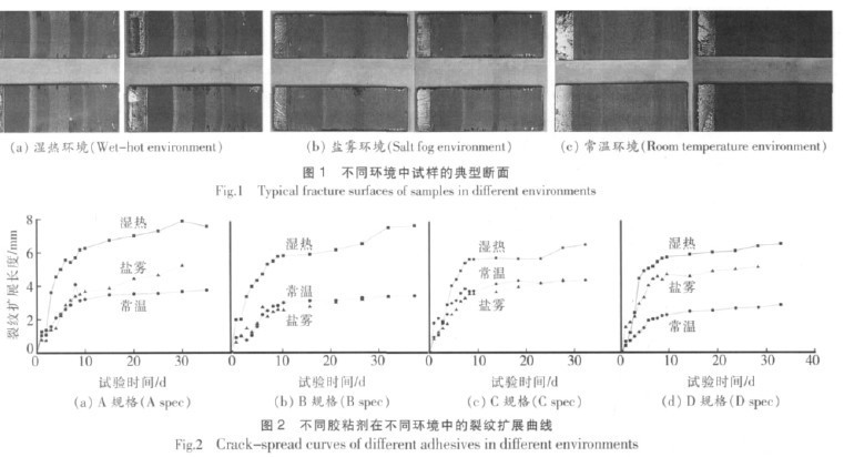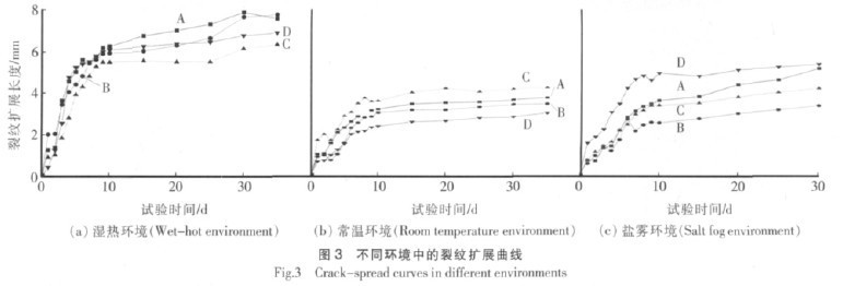 依次為 D>A>B>C 常溫環(huán)境中,種規(guī)格膠粘劑的裂紋擴(kuò)展由快到慢依次為 C>A>B>D 鹽霧環(huán)境中,種規(guī)格膠粘劑的裂紋擴(kuò)展由快到慢依次為 D>A>C>B