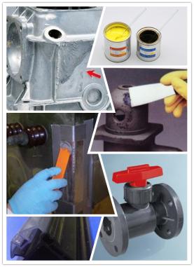 本產品多用金屬鑄件表面坑洞混入金屬粉末后修補,或對缸體裂縫修補及永久性密封;金屬框架間加固處理;金屬與金屬(非金屬)之間復合膠結;非金屬PVC、ABS也能膠結而且效果比一般AB膠要好很多。