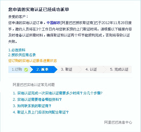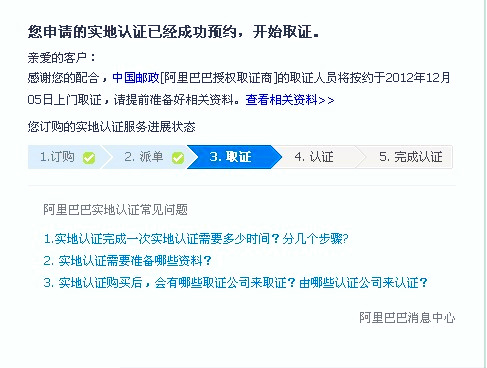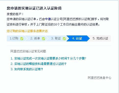 阿里巴巴實(shí)地認(rèn)證服務(wù)分為取證與認(rèn)證兩個(gè)環(huán)節(jié),取證服務(wù)有特定的取證商:中國(guó)郵政和中誠(chéng)信;認(rèn)證服務(wù)有特定的認(rèn)證商:中誠(chéng)信,杭州中德,北京匯華。如果你那的材料齊全,在上門取證后的16個(gè)工作日內(nèi)會(huì)有認(rèn)證結(jié)果(認(rèn)證成功或認(rèn)證失。⑶业綍r(shí)會(huì)有旺旺浮出提醒。