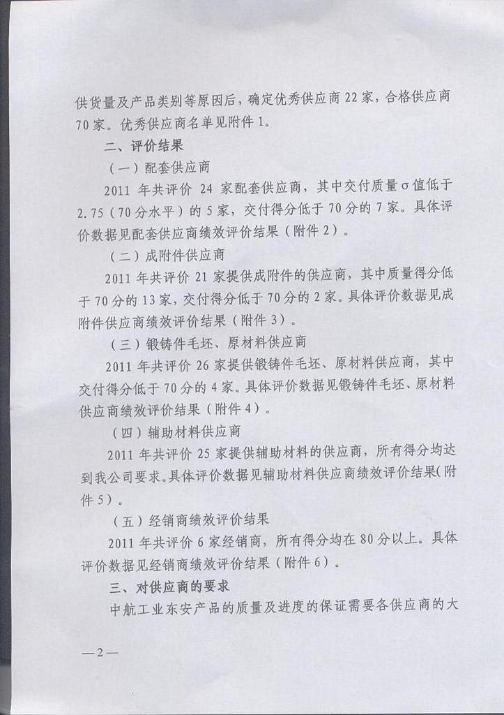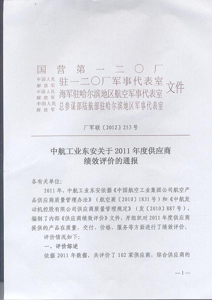 因高溫密封膠產(chǎn)品榮獲國營二0廠(中航工業(yè)東安發(fā)動機集團公司)2011年度優(yōu)秀供應(yīng)商稱號